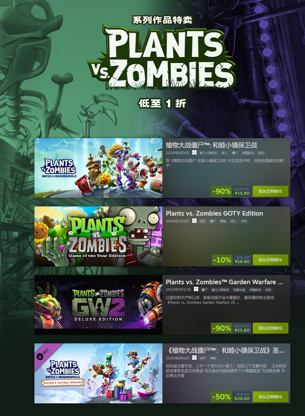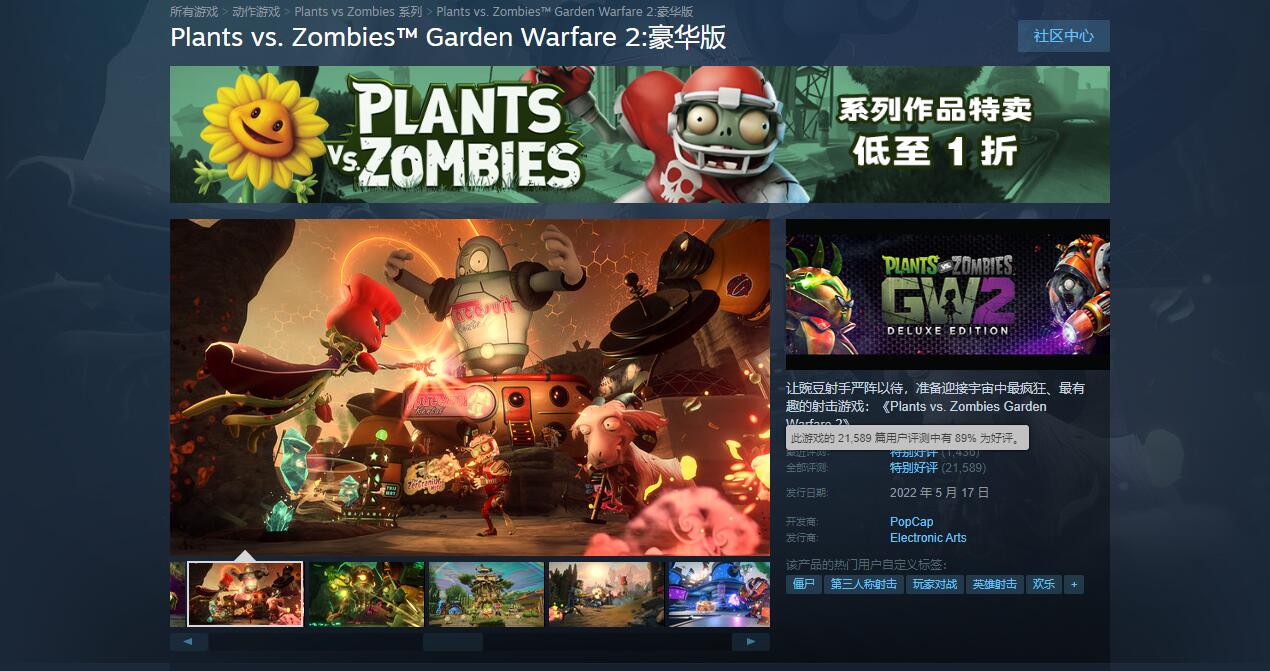 【《植物大战僵尸:花园战争2》“骨折”后玩家峰值创历史记录】《植物大战僵尸:花园战争2 豪华版》已于日前在Steam上开启了1折促销。得益于此次的优惠活动,本作近24小时的在线玩家游玩峰值现已经达到9086人,超过了游戏首发时的4888人。《植物大战僵尸:花园战争2 豪华版》目前在Steam上拥有21589条评测,玩家整体好评率89%。游戏国区售价(折后新史低)15.8元,优惠预计在7月30日23:00点结束。