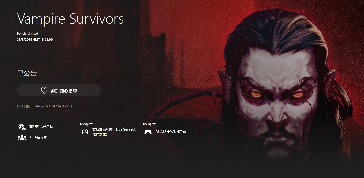 《吸血鬼幸存者》将于8月29日登录PS平台
