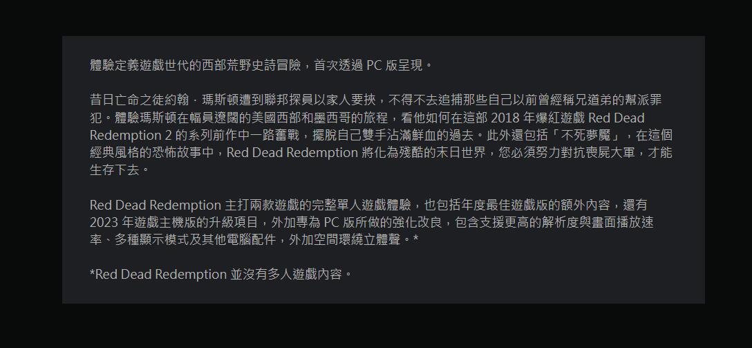 据介绍,PC版游戏会在去年发布的主机版基础上,额外追加对更高分辨率和帧数,其他尺寸屏幕,以及键鼠输入等功能的支持。由于该段描述不仅过于具体,且以不同语言录入到了各地区PS商城页面里,因此几乎可以视作对PC版本的“另类官宣”。《荒野大镖客:救赎》发售至今还从未正式登陆过PC,这款原作发行于2010年的游戏,在去年8月17日被移植到了PS4和Switch平台,并追加了中文支持。