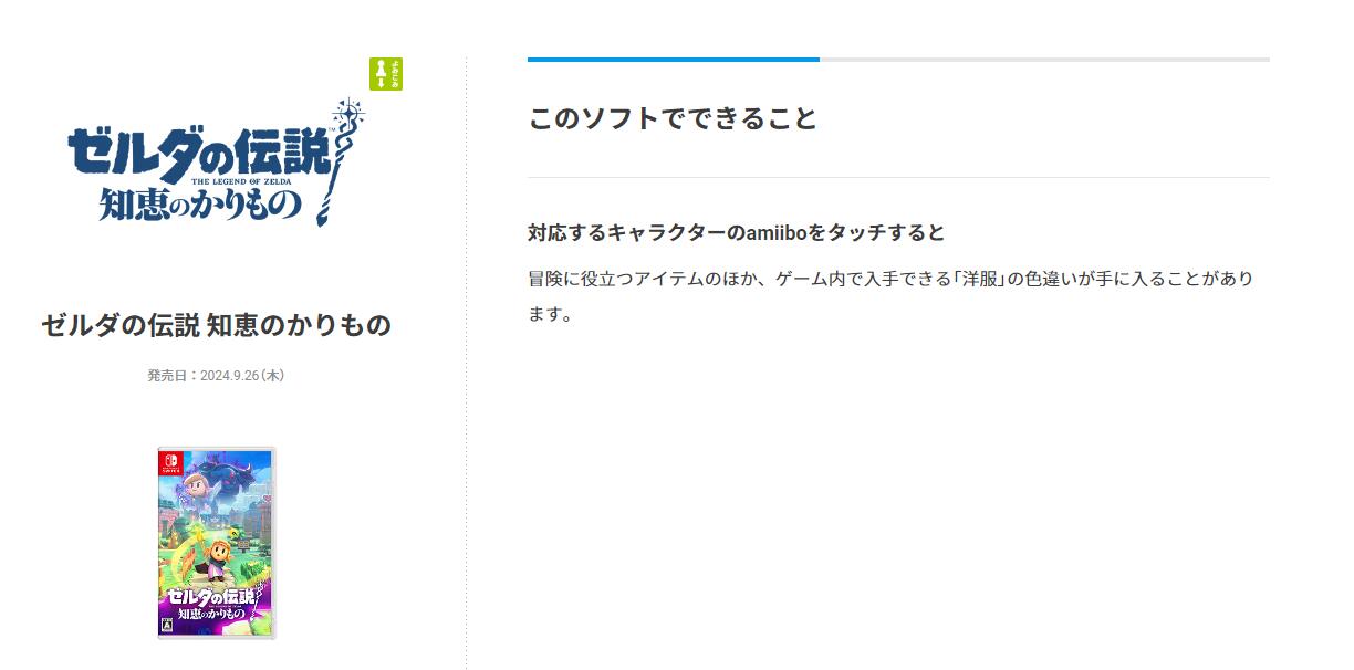 【《塞尔达传说:智慧的再现》支持Amiibo,可获得颜色不同的衣服】根据任天堂官网信息显示,新作《塞尔达传说:智慧的再现》支持Amiibo。玩家使用后,可在游戏中获得对冒险有用的道具、以及颜色不同的衣服。塞尔达系列的Amiibo基本都可在本作中使用(具体可在附图中查看),目前尚不确定具体对应的内容以及刷出来的衣服等物品能否通过游戏获得。《塞尔达传说:智慧的再现》讲述了在失去林克的海拉尔中,塞尔达公主使用“复制”之力展开冒险的故事。游戏将于9月26日登录NS,支持中文及“任亏券”兑换。