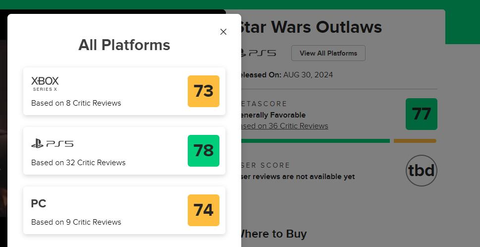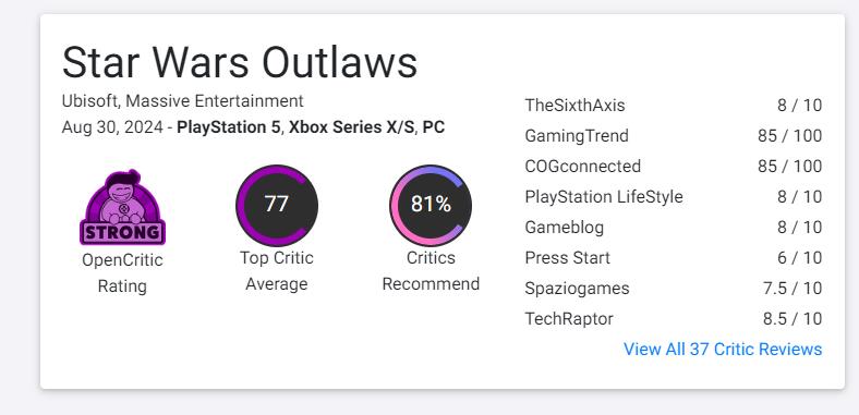 【《星战:法外狂徒》全球媒体评分出炉:MC均分77】由育碧所带来的首款开放世界星战游戏《星球大战:法外狂徒》全球媒体评测现已解禁。本作目前在MC上,PC版均分74(暂由9家媒体给出)、PS5版78分(暂由32家媒体给出)、Xbox版73分(暂由8家媒体给出);OpenCritic上均分为77,暂时收录了37家媒体。部分媒体评价如下: