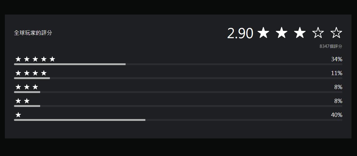 本作目前虽在Steam上有70%的好评率(433条评测),不过自游戏上线以来,其玩家峰值仅有697人,甚至不如去年的《魔戒:咕噜》。在PSN上游戏评分2.9,8347个评价中五星好评率34%。