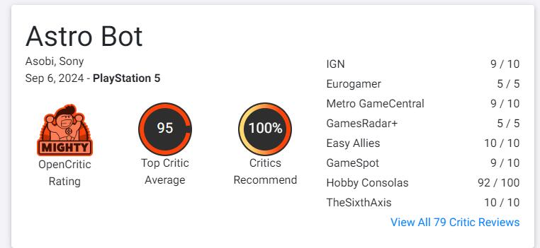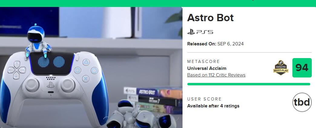 【《宇宙机器人》在PSN商店中全球玩家好评率“99%”】由PlayStation第一方工作室Team ASOBI所带来的3D动作平台游戏《宇宙机器人》现已在PS5上正式推出。截至目前,游戏在PSN商店中已有747个评分,全球玩家评分4.99,其中五星好评率高达99%。在昨晚解禁的媒体评测中本作也有着出色的表现。《宇宙机器人》现在MC上的均分为94(由112家媒体给出),OpenCritic则有95分(暂时收录了79家媒体)。