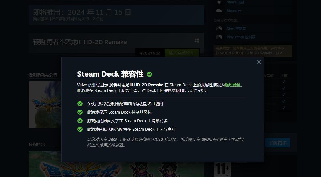 【《勇者斗恶龙3:HD-2D重制版》现已通过STEAM DECK验证】根据Steam商店页面显示,《勇者斗恶龙3:HD-2D重制版》现已通过了STEAM DECK验证。这也意味着游戏上市时玩家就可以在STEAM DECK掌机上完美体验这款使用全新画面表现技术而重获新生的经典作品。《勇者斗恶龙3:HD-2D重制版》将于11月14登录PS5/NS/ Xbox Series/PC,游戏也会在本月的东京电玩展上亮相并提供试玩。作为“洛特三部曲”的其他两作《勇者斗恶龙1&2:HD-2D重制版》将于明年到来。