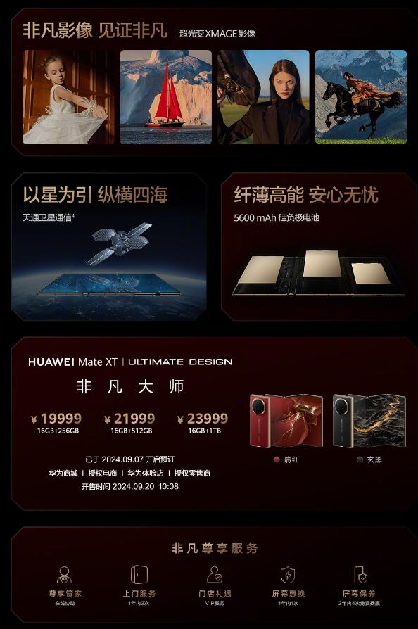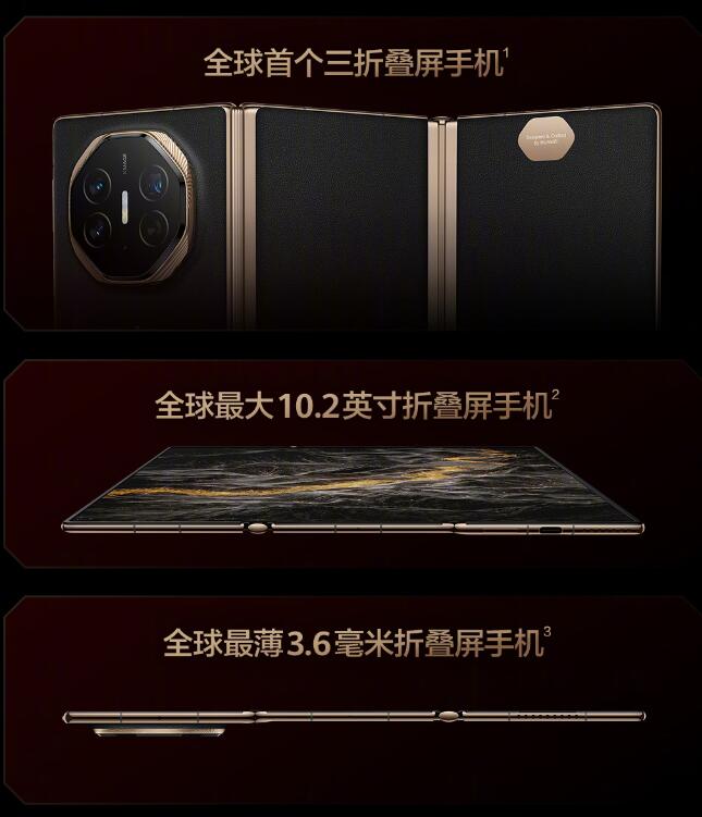 【华为三折叠屏手机公布,售价19999元起】在今日举行的华为新品发布会上,全球首个商用三折叠屏手机“HUAWEI Mate XT”非凡大师正式公布。它是全球最大(10.2英寸)、最薄(3.6毫米)的折叠屏手机,提供了玄黑和瑞红两种配色。其售价16GB+256GB版19999元、16GB+512GB版21999元、16GB+1TB版23999元。产品已于9月7日开启预订,预计9月20日10:08正式发售。
