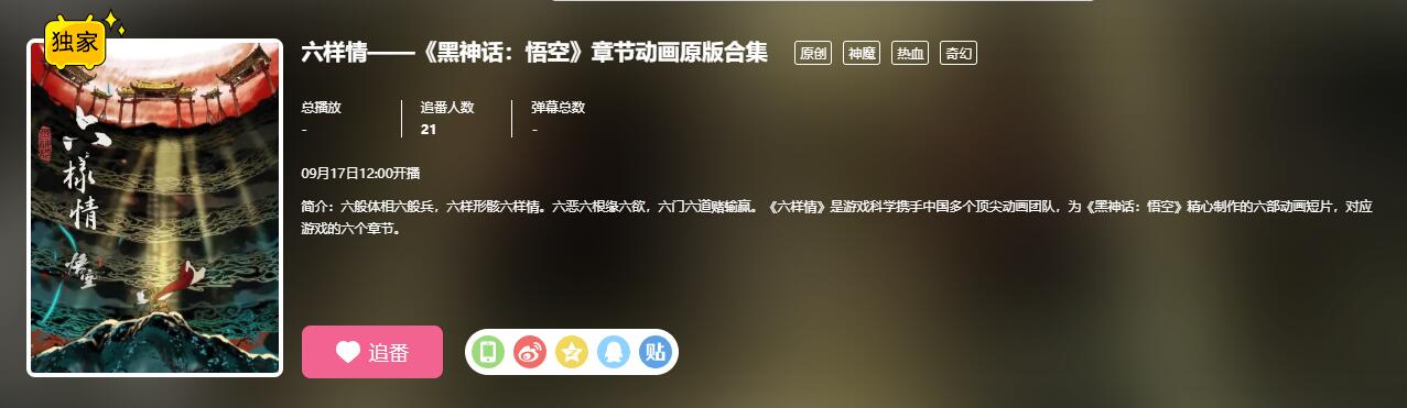 【《黑神话》章节动画原版合集“六样情”17日上线B站】《黑神话:悟空》章节动画原版合集《六样情》将于9月17日中午12点独家上线B站。目前,在B站国创剧集页面上已经可以点击“追番” 来进行预约。《六样情》是游戏科学携手中国多个顶尖动画团队,为《黑神话:悟空》精心制作的六部动画短片,对应游戏的六个章节。官方海报及游戏/原版本对比如附图所示。此外,八部动画幕后专访视频也将独家在B站陆续发布。