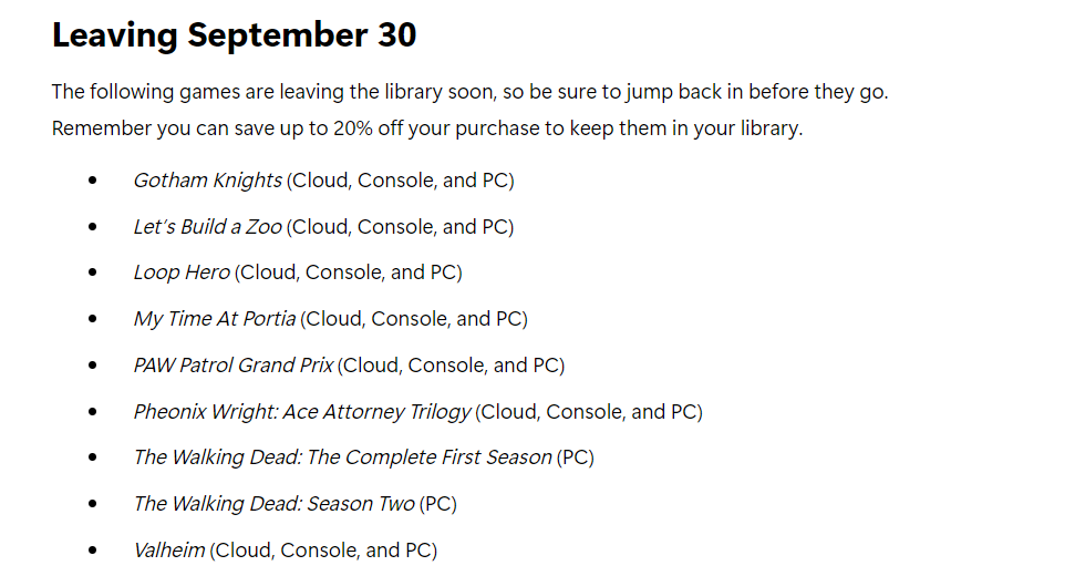 9月30日:《哥谭骑士》 (云端/主机/PC),《一起来建造动物园吧!》 (云端/主机/PC),《循环勇士》 (云端/主机/PC),《波西亚时光》 (云端/主机/PC),《汪汪队立大功:锦标赛》 (云端/主机/PC),《逆转裁判123成步堂精选集》 (云端/主机/PC),《行尸走肉:第一季完全版》(PC),《行尸走肉:第二季》 (PC),《英灵神殿》 (云端/主机/PC)