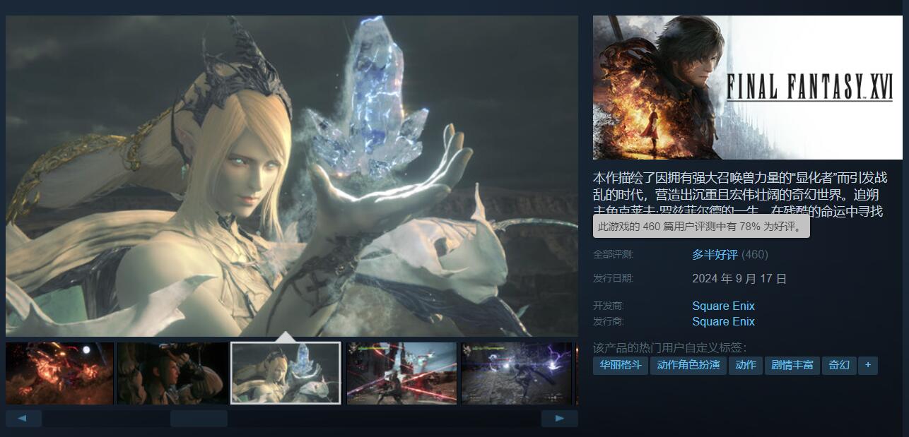 【《最终幻想16》Steam上获玩家“多半好评”】人气RPG《最终幻想》系列最新作《最终幻想16》PC版现已正式发售。本作由《最终幻想14》的制作人吉田直树率领团队打造。截至目前游戏在Steam上的评测已有460条,其中玩家好评率78%,整体为“多半好评”。与之前PS5版一样,大多数玩家认为游戏演出、音乐等方面都非常不错,不过支线和剧情上面存在些许不足。优化上,不少玩家建议打上动画帧率解锁补丁并更新显卡驱动来加强游戏的体验。《最终幻想16》Steam国区标准版售价298元,附带DLC“沧海恸哭/天空余音”的完全版398元(拓展内容也可单独购买),游戏支持中文。