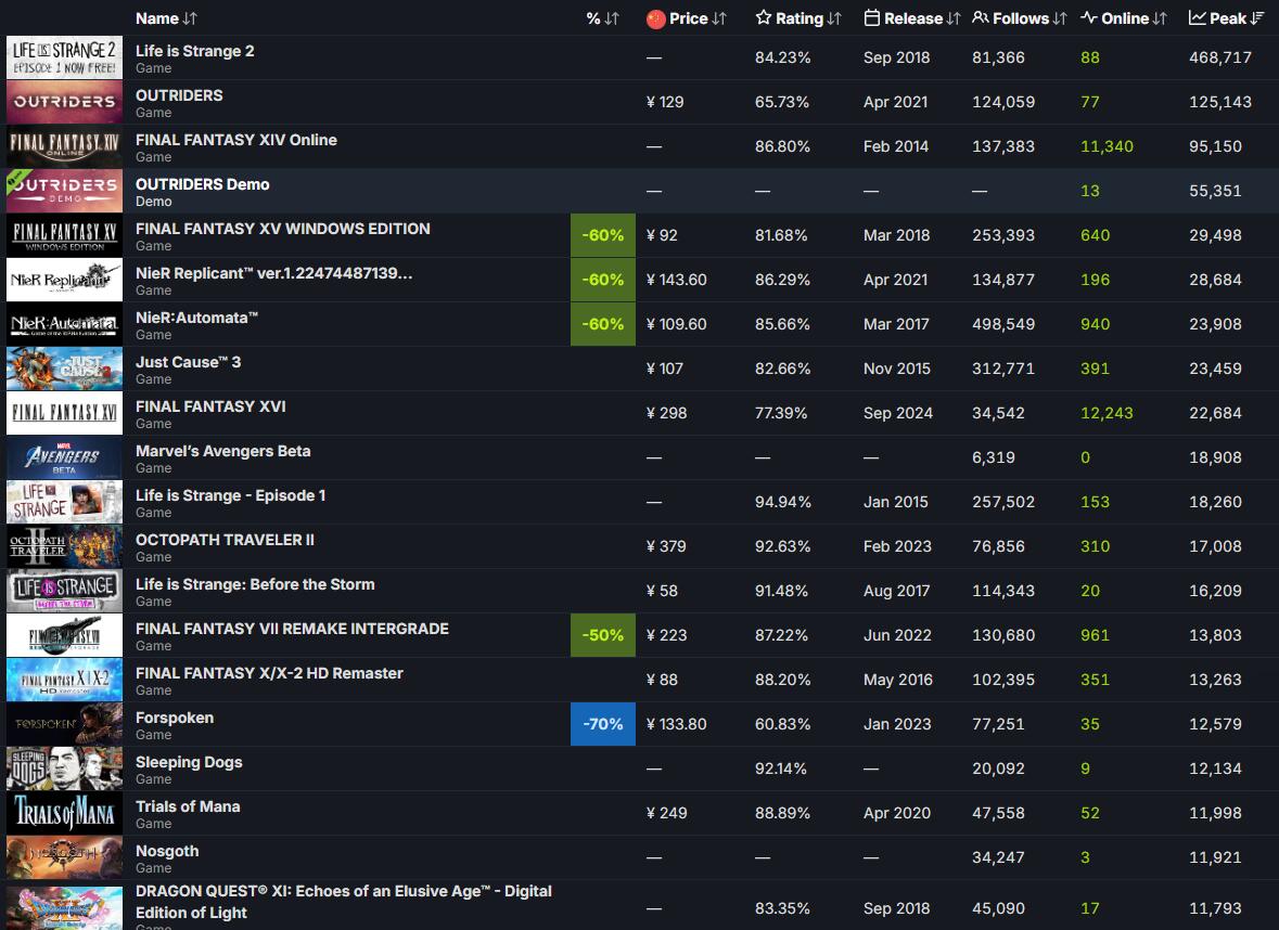 《最终幻想16》Steam玩家峰值2.2万,暂不及前作《最终幻想15》