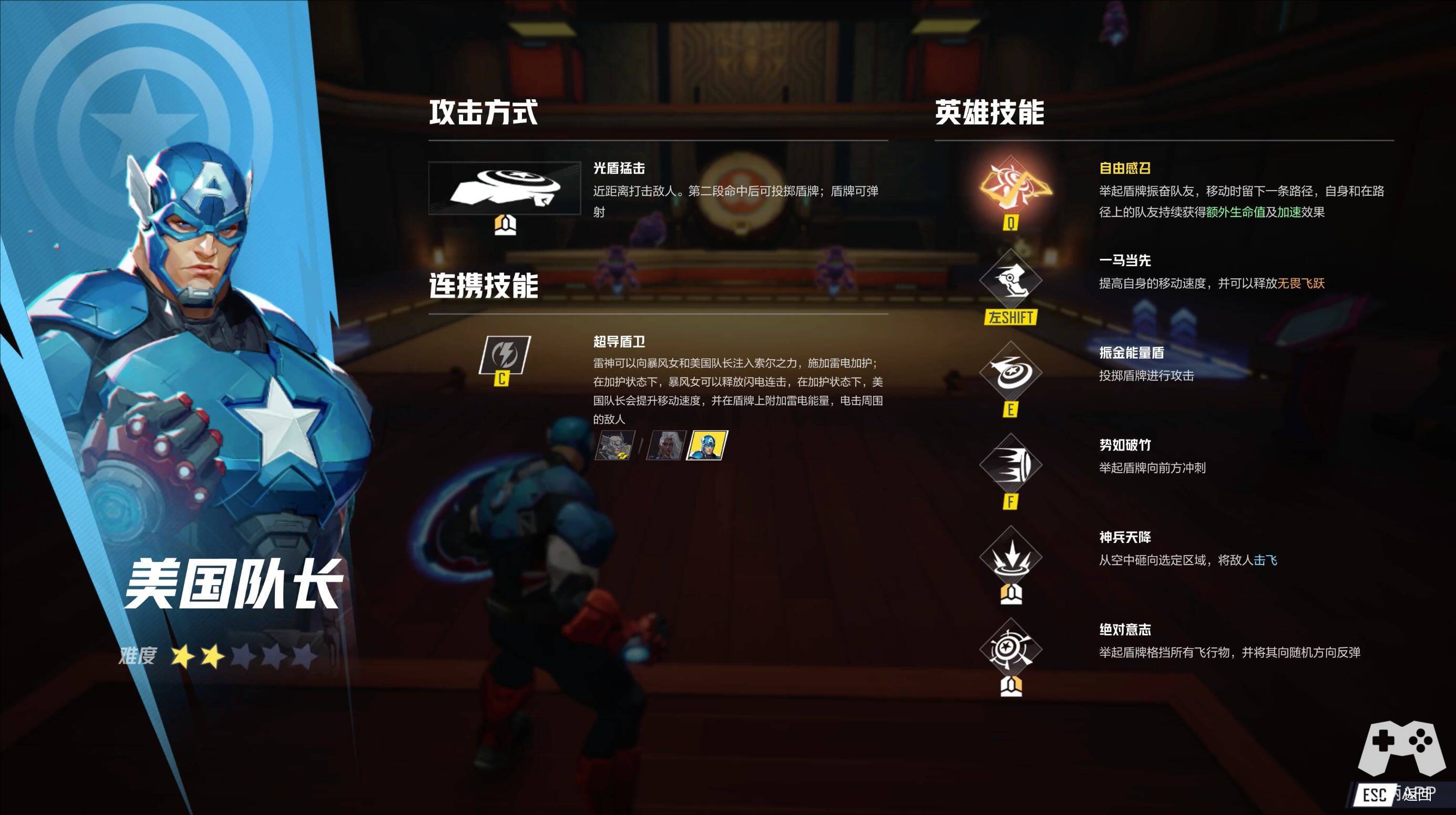 美国队长的攻击方式主要以近距离拳击为主,并辅助使用盾牌进行冲刺或收割远处的敌人。