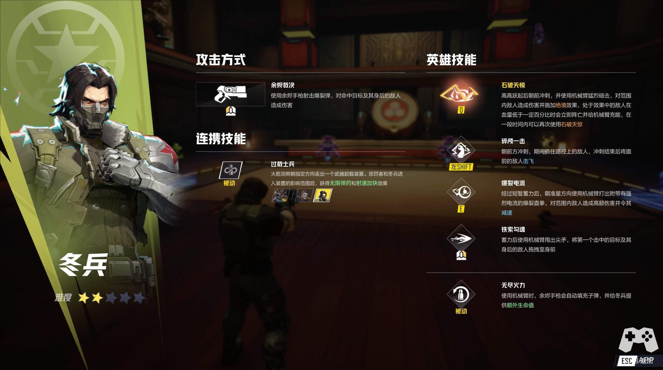 说完美队后,再来说说冬兵这位英雄。目前冬兵在游戏内的定位是一位输出类英雄,他的击杀方式,可以说十分依赖玩家对其的熟练度,主要的攻击方式是使用子弹量较少的手枪进行血量上的削弱后,在使用小技能对其进行辅助斩杀。