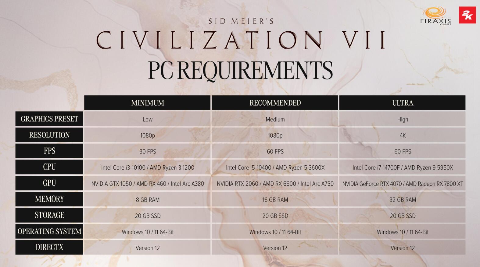 【《文明7》PC配置要求公布:最低1050即可游玩】《文明7》官方今日公布了本作的PC版配置要求。本作将于2025年2月11日登录PC/PS5/Xbox Series/PS4/Xbox One/NS(主机平台表现状况暂未公布),具体PC要求如下: