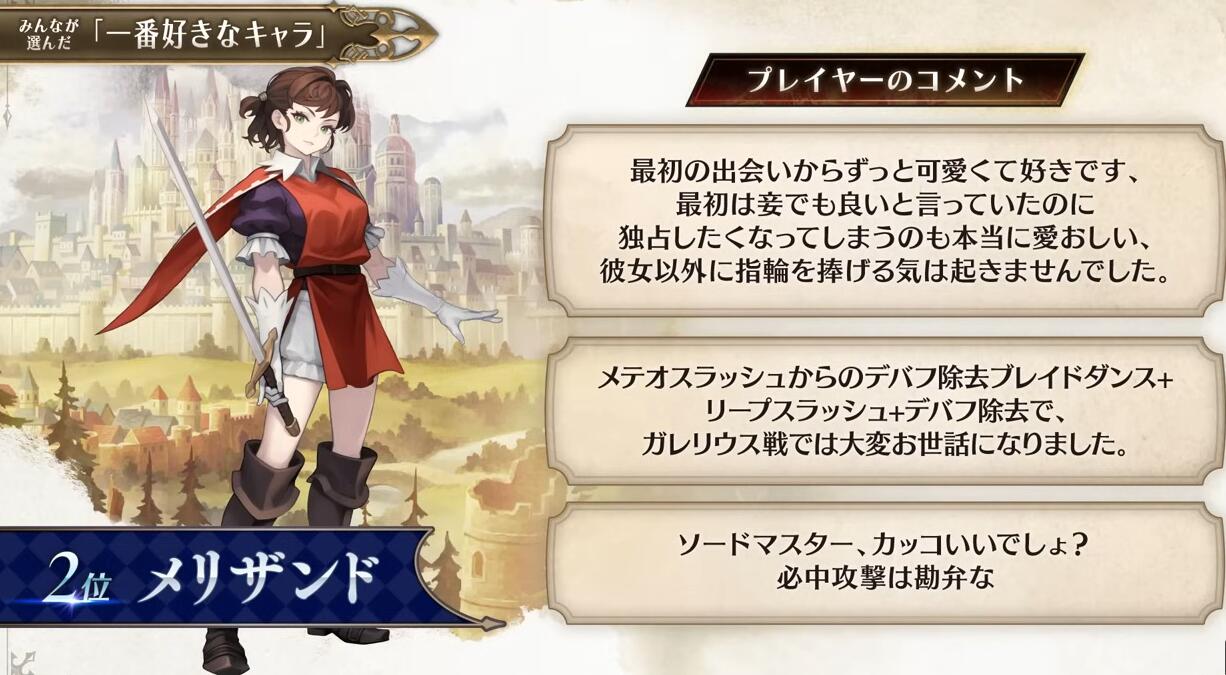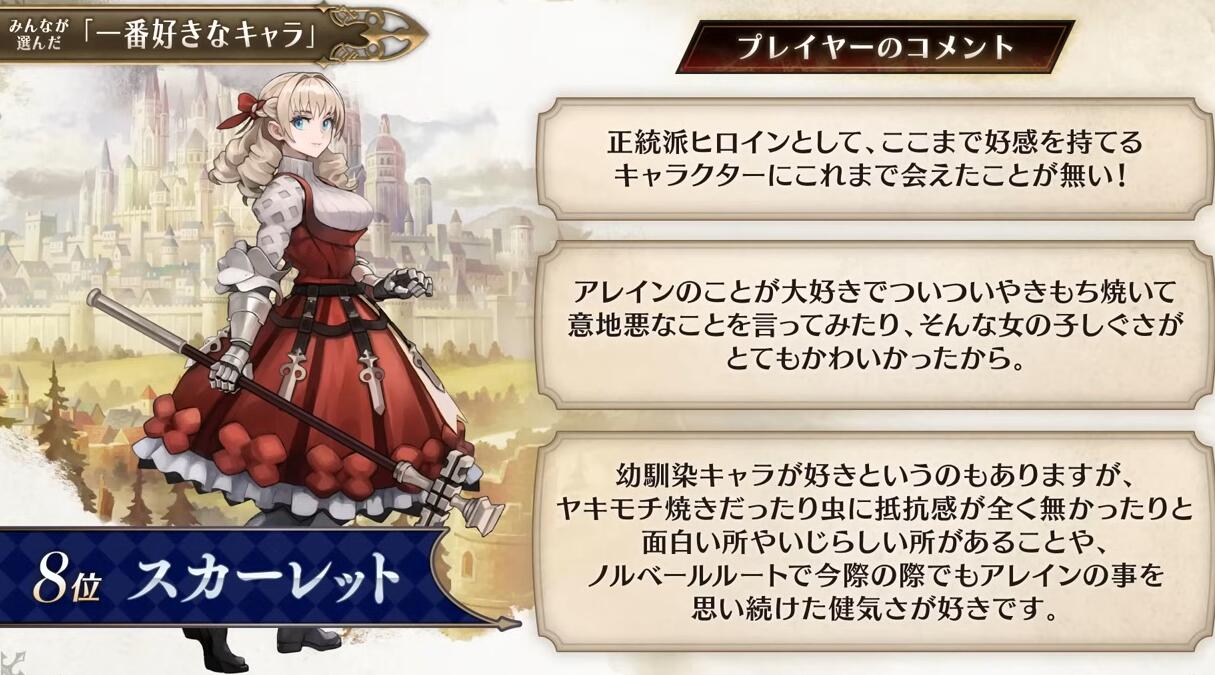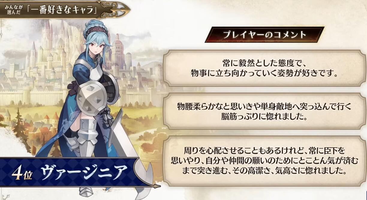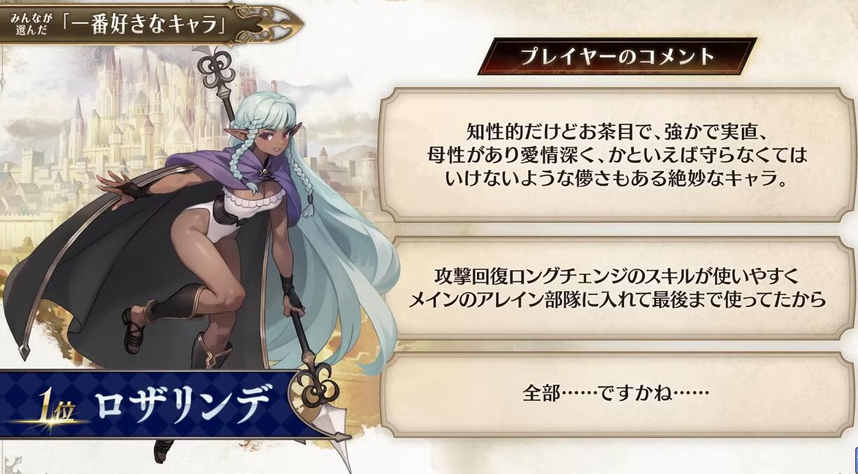【“侧妃名不虚立”《圣兽之王》角色人气排名公布】Atlus在近期的《圣兽之王》100万突破纪念特别节目中公布了本作的角色人气排名(由玩家投票选出)。不知和大家心中的想法是否一致呢?具体名单如下: 1、罗莎琳德 2、梅丽桑德 3、贝伦加丽娅 4、弗吉尼亚 5、亚连 6、艾尔特琳德 7、优妮菲 8、斯嘉丽 9、克洛伊 10、崔维斯