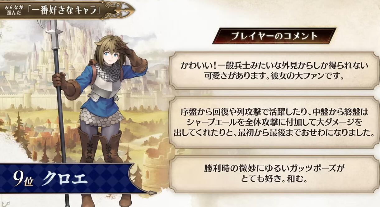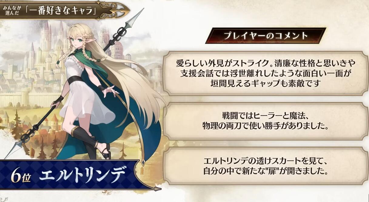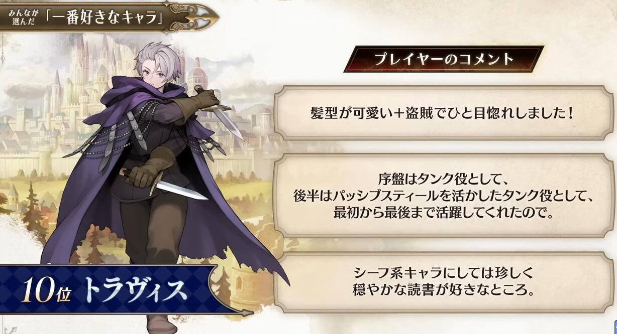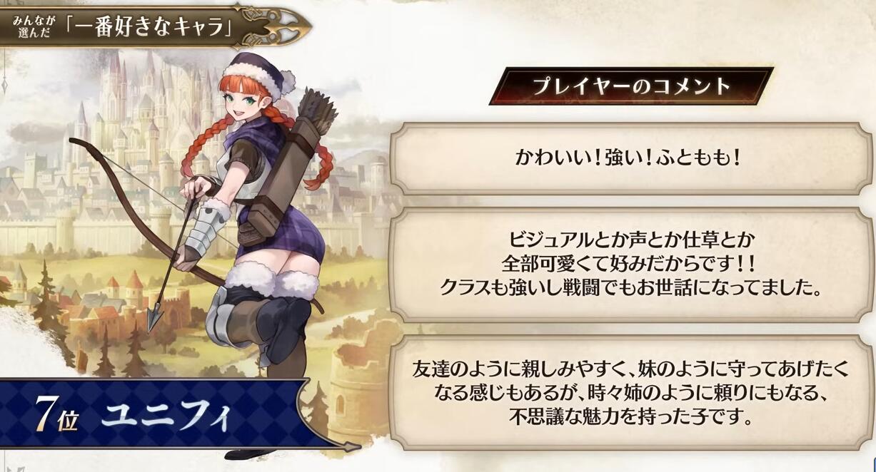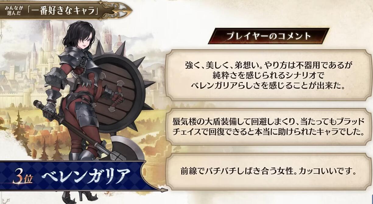 【“侧妃名不虚立”《圣兽之王》角色人气排名公布】Atlus在近期的《圣兽之王》100万突破纪念特别节目中公布了本作的角色人气排名(由玩家投票选出)。不知和大家心中的想法是否一致呢?具体名单如下: 1、罗莎琳德 2、梅丽桑德 3、贝伦加丽娅 4、弗吉尼亚 5、亚连 6、艾尔特琳德 7、优妮菲 8、斯嘉丽 9、克洛伊 10、崔维斯