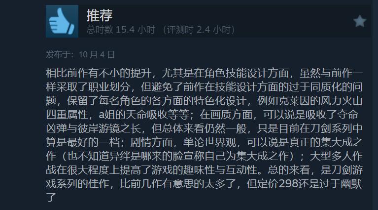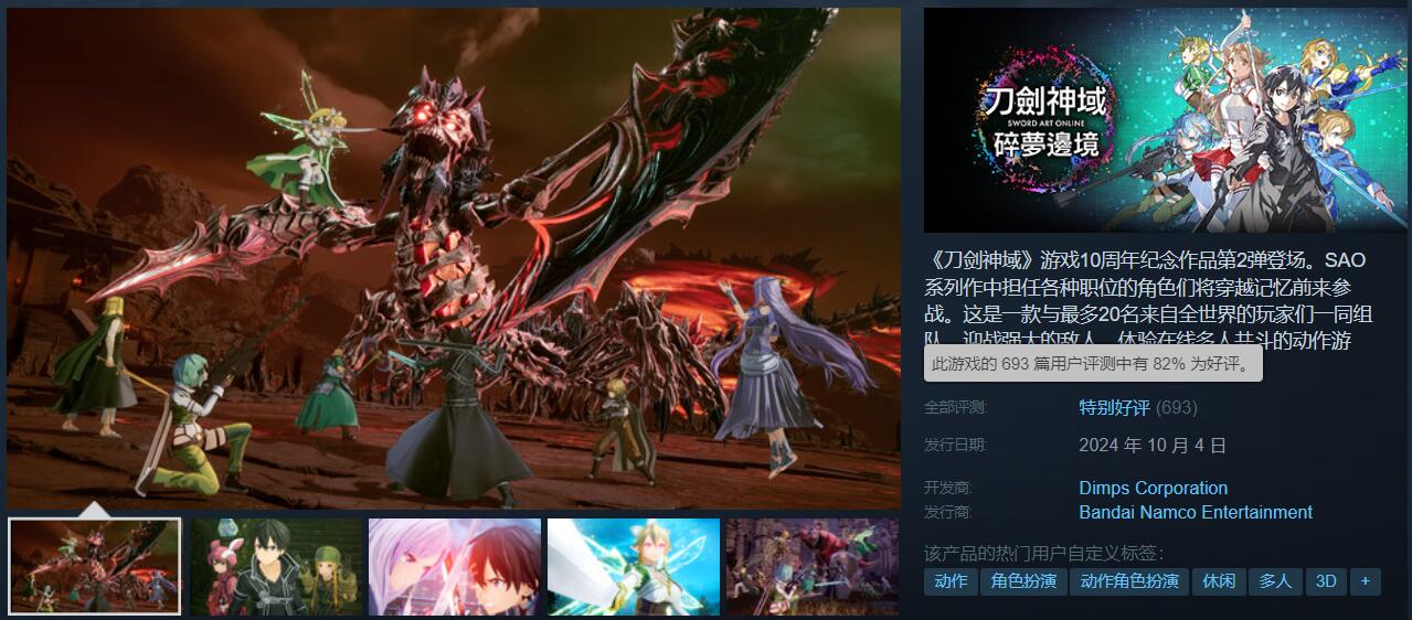 【《刀剑神域:碎梦边境》Steam上获玩家“特别好评”】《刀剑神域》游戏10周年纪念作品第2弹《刀剑神域:碎梦边境》现已正式发售。本作一款可与最多20名来自全世界的玩家们一同组队,迎战强大的敌人,体验在线多人共斗的动作游戏(提供可享受原创剧情的离线专用的故事模式)。截至目前,游戏在Steam上已有693条玩家评测,其中好评率82%,整体为“特别好评”。不少玩家表示,虽然游戏依旧比较粉丝向,其中也有个别不足之处,但相较前作有着不小的提升,在系列中也算是出类拔萃的存在。《刀剑神域:碎梦边境》在Steam上标准版售价298元,游戏支持中文。
