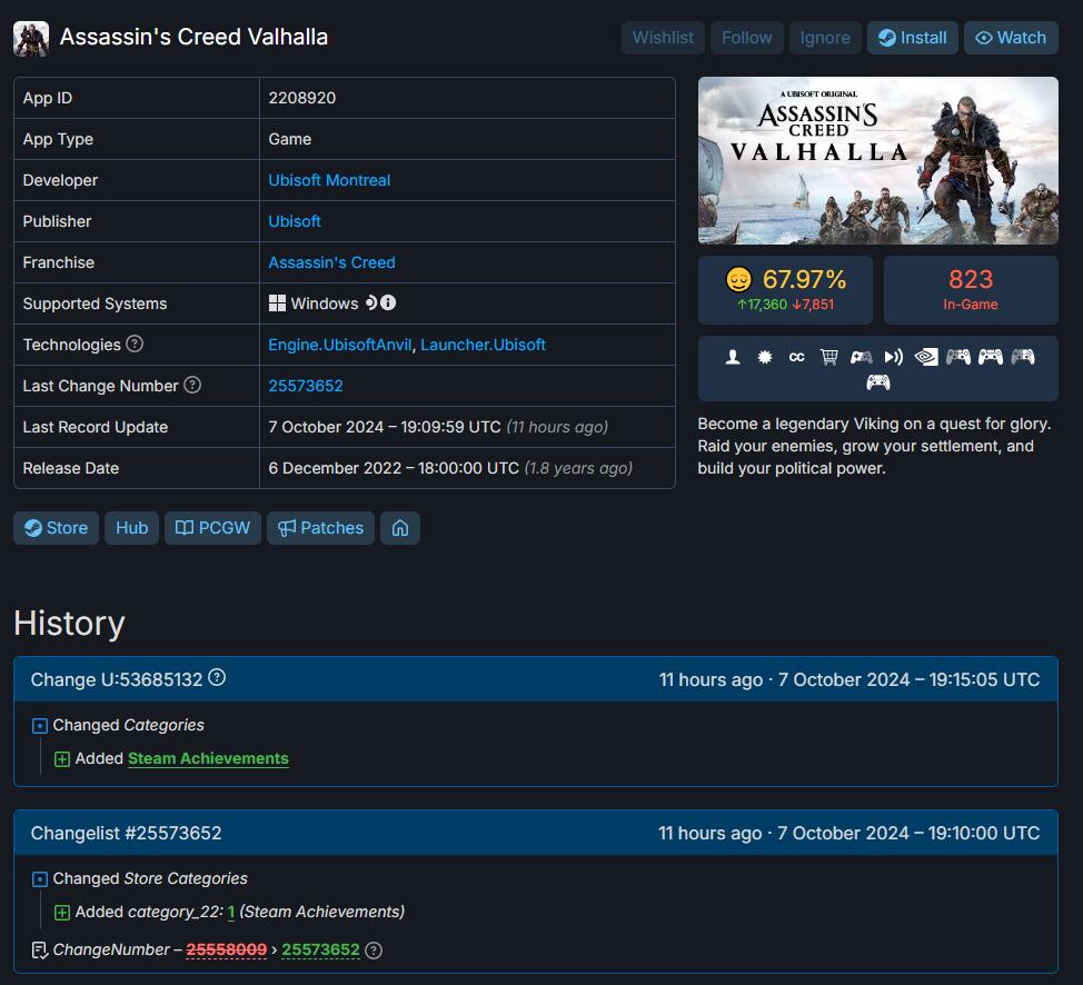 【《刺客信条:英灵殿》即将添加Steam成就】根据SteamDB所提供的数据显示,育碧近日在后台对《刺客信条:英灵殿》进行了成就的更新。目前商店页面已显示“Steam成就”,不过截至目前还尚未进行正式的添加。本作于2022年12月登录Steam,之前一直未有成就系统。此次的行动或许也表明育碧为提高旗下作品的销量,对该平台的重视程度越来越高。除了近期将登陆Steam的《刺客信条:幻景》《星球大战:法外狂徒》外,延期的《刺客信条:影》明年也会在发售时直接登录该平台。官方此前在公告中表示,此次的同步是其未来新作首发回归Steam的标志。