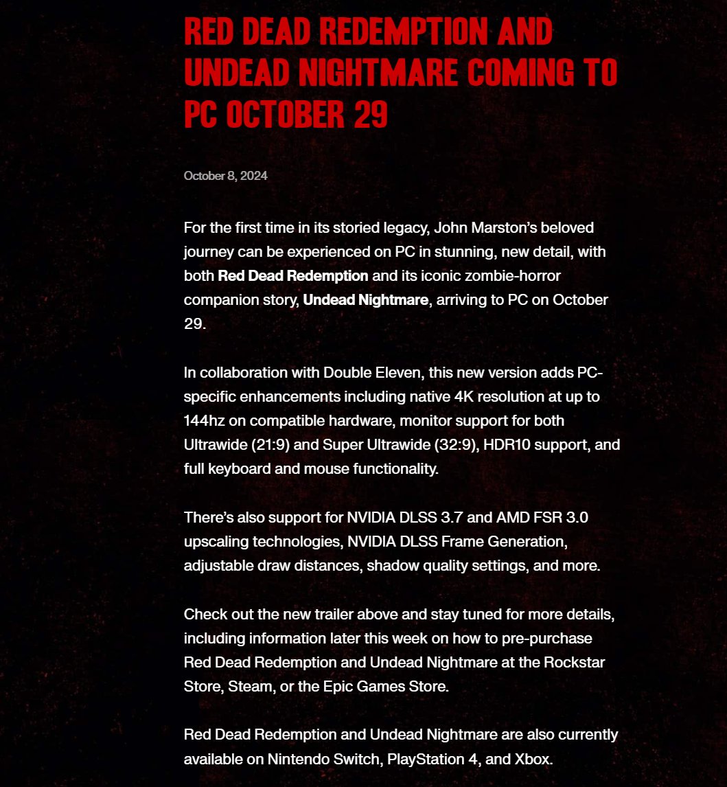 【初代《荒野大镖客》将于10月29日登陆PC】R星官方宣布,《荒野大镖客:救赎》及僵尸模式拓展内容将于10月29日登陆PC平台,届时游戏会在Steam/Epic/R星商城同时上架。负责本次移植工作的依旧是Double Eleven工作室,他们在去年将游戏带到了PS4和Switch平台。