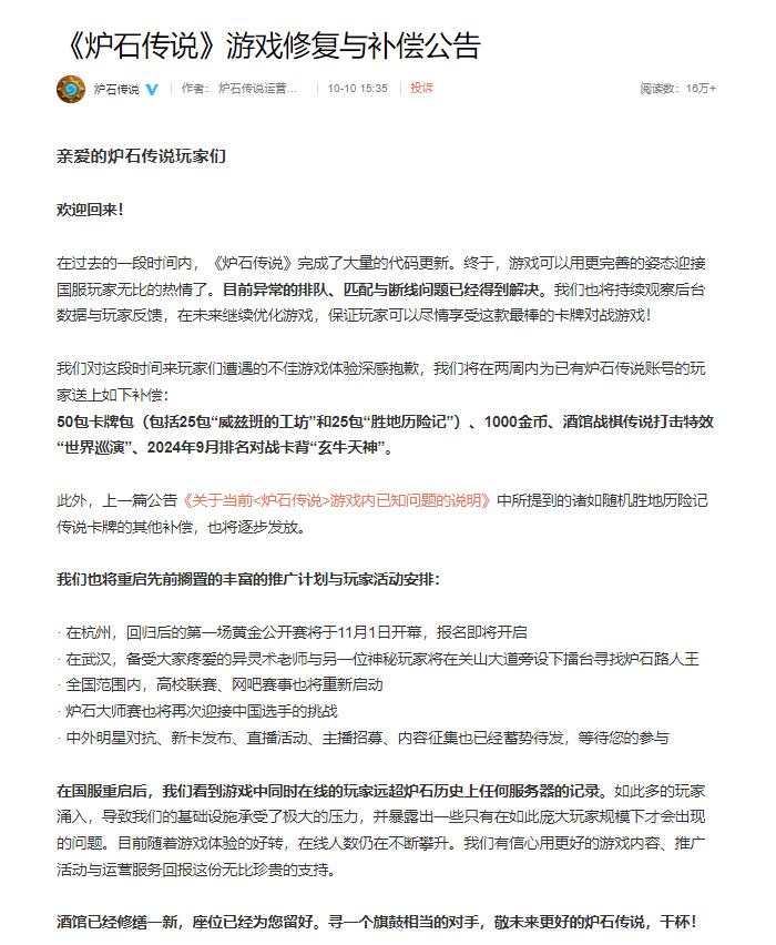 【《炉石传说》游戏现已恢复正常,补偿50卡包及金币卡背等】《炉石传说》官方微博今日宣布游戏服务现已恢复正常,并发表了“游戏修复与补偿公告”。运营团队表示目前国服异常的排队、匹配与断线等问题已经得到解决。对这段时间为大家所带来的不便,官方将在两周内为玩家们送上补偿:“50包卡牌包(包括25包“威兹班的工坊”和25包“胜地历险记”)、1000金币、酒馆战棋传说打击特效‘世界巡演’、2024年9月排名对战卡背‘玄牛天神’”。