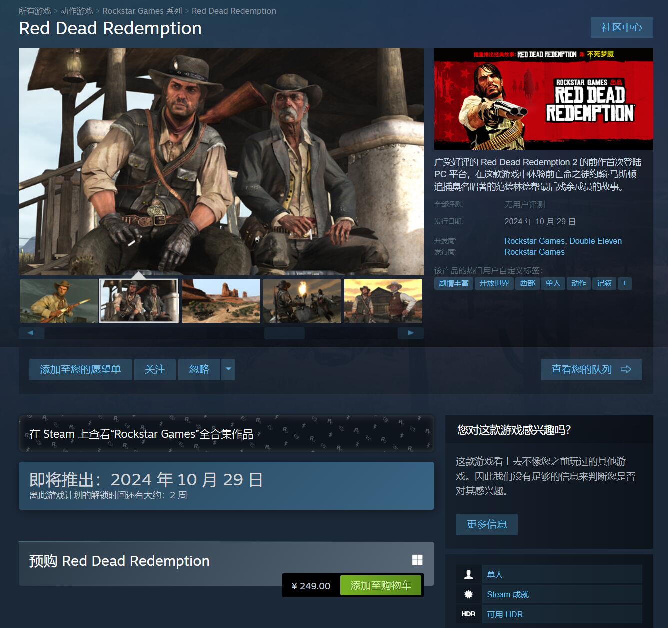 【《荒野大镖客:救赎》Steam定价249】初代“大表哥”《荒野大镖客:救赎》已上架Steam商店,本作在国区的定价为249元,将在10月29日正式发售。根据此前的官方公告,本次游戏的PC版本由Double Eleven工作室负责。游戏将支持4K原生分辨率及最高144帧,并适配了21:9和32:9的宽屏显示器。对HDR10,DLSS3.7,FSR3.0的支持也是一应俱全,本作也将同步登录Epic商店。