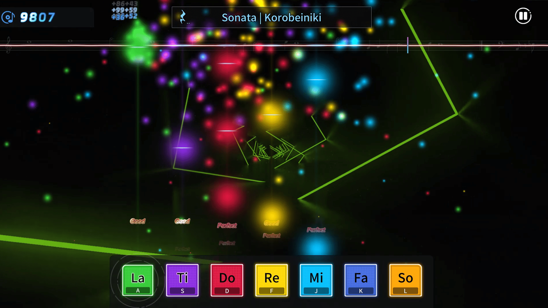 游戏中有7键和12键两种键位,对应曲目的不同难度,7键对应钢琴中的7个白键,12键则对应一个八度中的所有黑键白键。对于有音乐基础的玩家来说,这就是一个模拟演奏的游戏,玩的同时也是在真正的演奏。游戏中也内置了录音功能,可以随时回放自己演奏的成果,甚至还可以自己录制音轨进行合并,成为真正的作曲家。