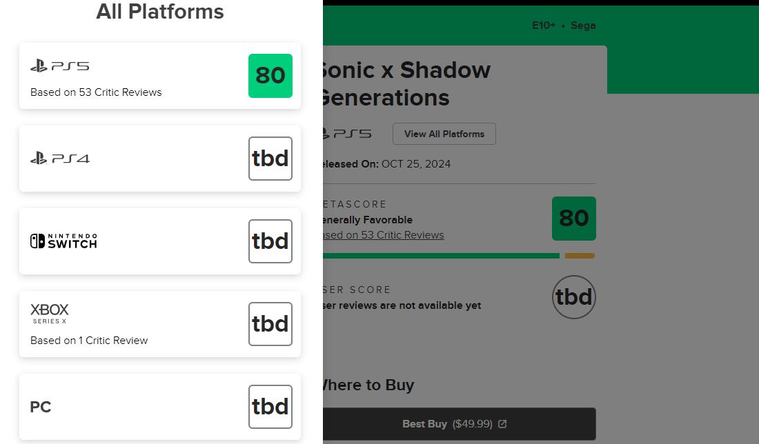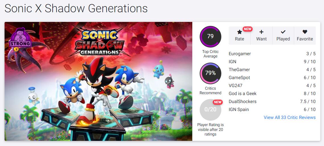 《索尼克x夏特:世代重启》MC均分80,获IGN 9分、GS6分评价