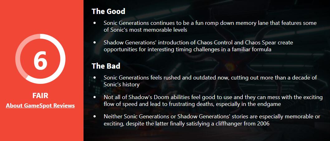 GameSpot(6分):《索尼克世代》在现代感觉已经过时,夏特的一些技能用起来感觉也不是很好,并且整个剧情平淡入水。