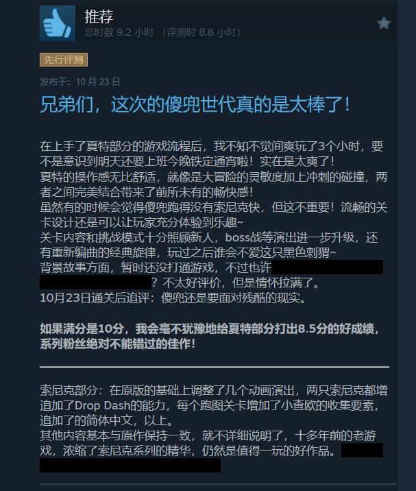 《索尼克×夏特:世代重启》Steam上获玩家“好评如潮”