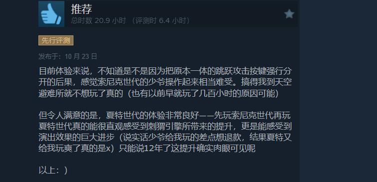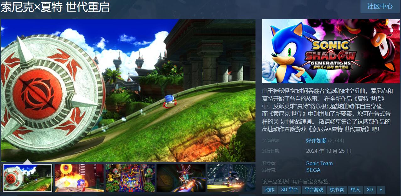 【《索尼克×夏特:世代重启》Steam上获玩家“好评如潮”】由世嘉所带来的高速动作冒险游戏《索尼克×夏特:世代重启》已于今日登录Steam。截至目前,本作在该平台上已有2744条评测,玩家好评率达97%,整体为“好评如潮”。大家普遍对这款游戏的质量给予了肯定,认为原本在系列中就出类拔萃的《索尼克世代》搭配全新的《夏特世代》给人带来了不错的体验。不过游戏在操作上存在些许不足,并且不少人觉得《夏特世代》的内容有点少。《索尼克×夏特:世代重启》在Steam上的标准版售价229元,豪华版299元,游戏支持中文并通过了STEAM DECK兼容性验证。
