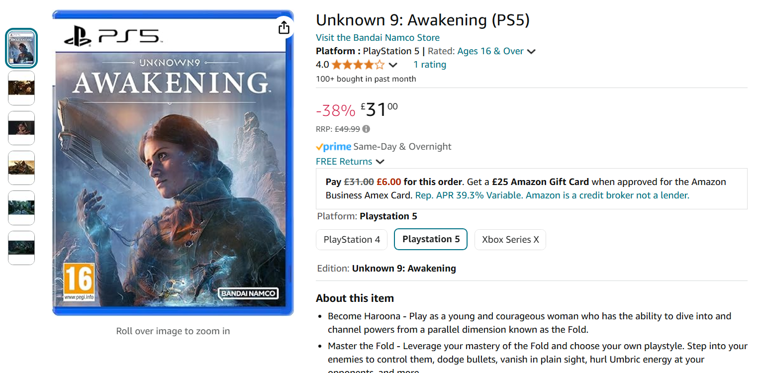 【《无名九使:觉醒》发售一周开始打折,英亚上只有一条评论】我们之前已经向各位报告过《无名九使:觉醒》上线后便遭遇滑铁卢,销量异常惨淡。而该游戏的实体版也逃不过厄运,游戏在英国亚马逊上已经开始打折,目前离首发仅过去一周的时间。但即便如此,该商品目前也只有一条评论。无论从哪个角度看,游戏当前形势已非常不乐观。