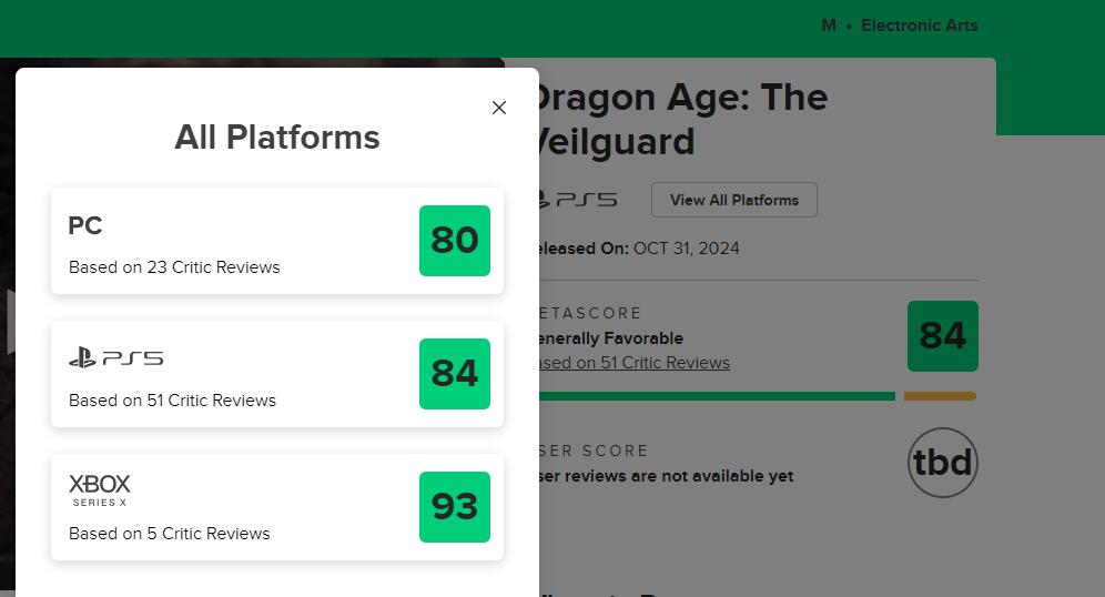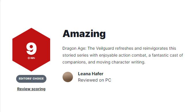 【《龙腾世纪》全球媒体评测出炉:MC均分84,获IGN 9分评价】由BioWare和EA所带来的单人RPG《龙腾世纪:影障守护者》全球媒体评测现已解禁。目前本作在MC上PS5版均分84分(由51家媒体给出),PC版80分(由23家媒体给出),Xbox版93分(由5家媒体给出)。IGN、GamesRadar给游戏打出9分、TheGamer给出8分、VGC打出3星评价。