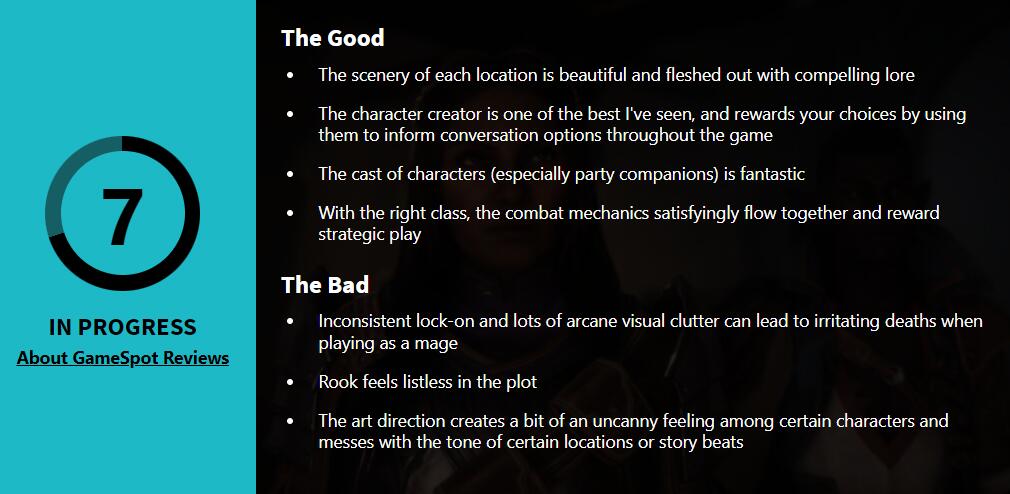 “整体来说这是BioWare一次出色的回归,不过游戏仍有不足之处。精美的风景、引人入胜的故事、优秀的角色(伙伴)塑造以及多样化的战斗系统都令人满意。不过本作在法师设计上有一些问题,主角在剧中的表现较为无趣,并且一些人物的艺术风格有点缺乏真实感。”
