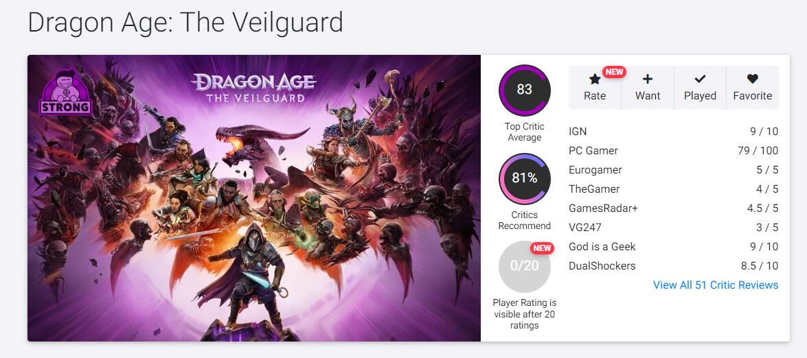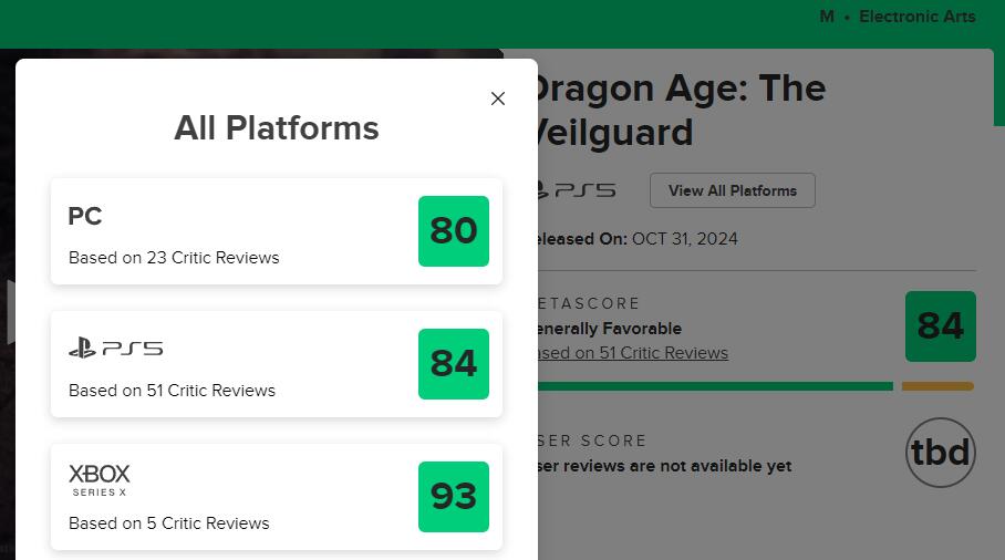 截至目前,《龙腾世纪:影障守护者》在MC上PS5版均分84(由51家媒体给出)、PC版均分80(由23家媒体给出)、Xbox版均分93(由5家媒体给出)。OpenCritic上均分83,暂收录了51家媒体。本作将于11月1日于玩家们正式见面,登录平台为PS5/Xbox Series/PC。