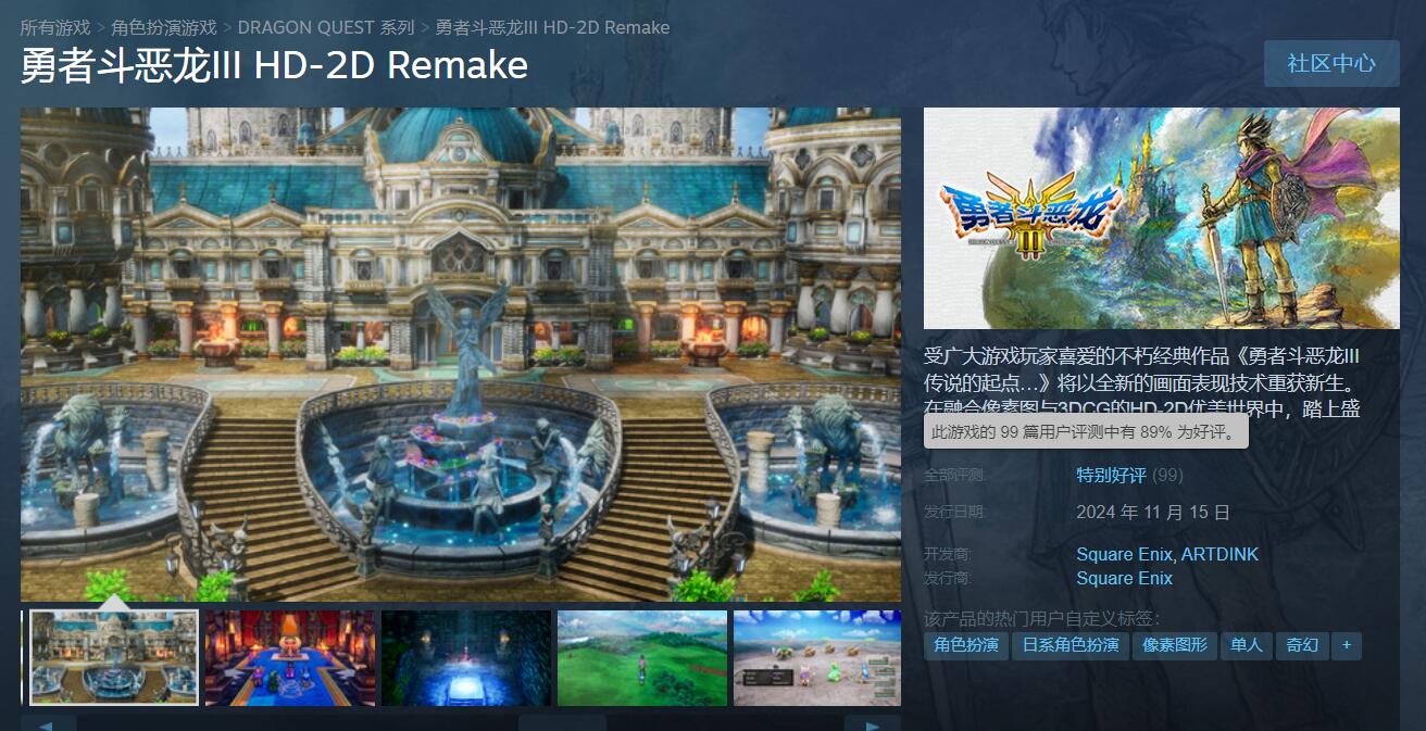 【《勇者斗恶龙3:HD-2D重制版》Steam上获玩家特别好评】由SE所带来的《勇者斗恶龙3:HD-2D重制版》现已在Steam上发售。截至目前游戏在该平台上已有99条玩家评测,其中好评率89%,整体为“特别好评”。本作首日在Steam上的在线玩家峰值数达到了15280人,为《勇者斗恶龙》系列作品的最高记录。虽然同样作为HD-2D的《八方旅人2》以17008的峰值数略微领先,但本作目前上线仅有几个小时,之后峰值人数仍有进一步提高的可能。《勇者斗恶龙3:HD-2D重制版》Steam版售价348元,游戏支持中文并通过了STEAM DECK兼容性验证。