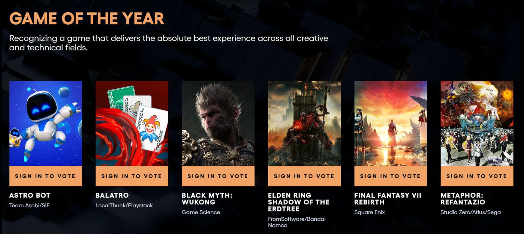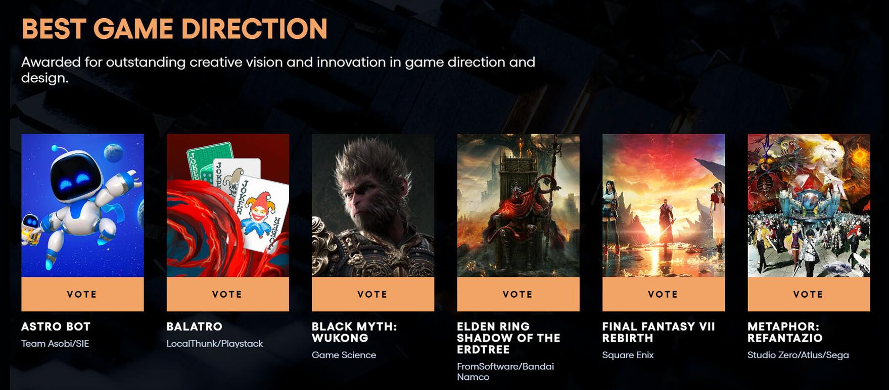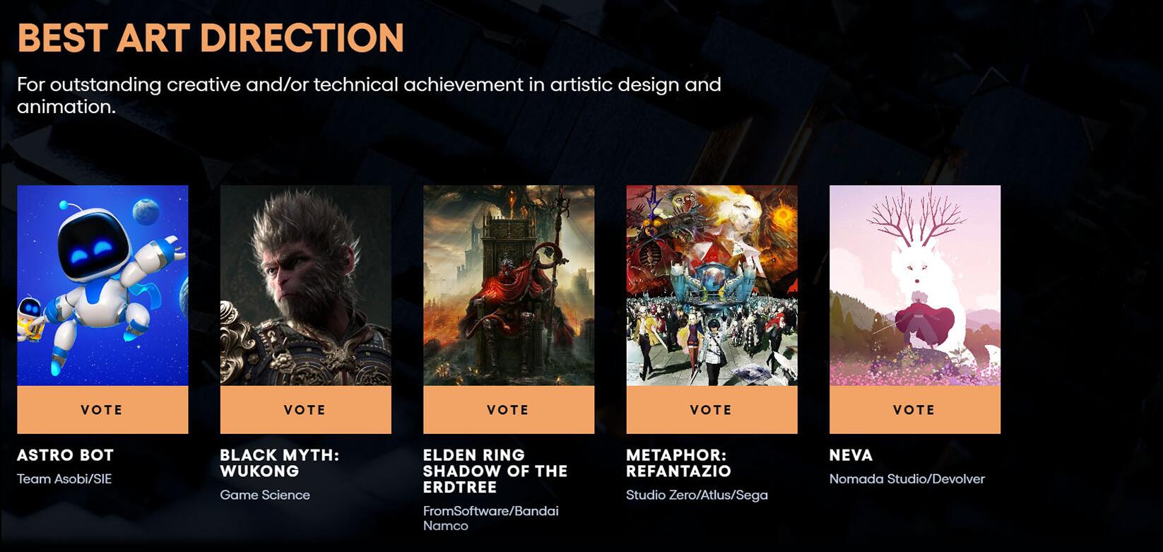【《黑神话:悟空》获TGA四项提名,官方感谢天命人们的支持】2024年度游戏大奖(TGA)各奖项提名名单已于今日凌晨正式公布。作为首次入围TGA的国产游戏《黑神话:悟空》共获得了4项提名,包括: