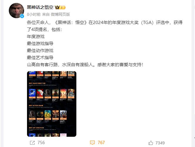 “山高自有客行路,水深自有渡船人。”《黑神话》官博今日在分享这4项提名之时,还向一路陪伴的各位“天命人”们表达了感激之情。