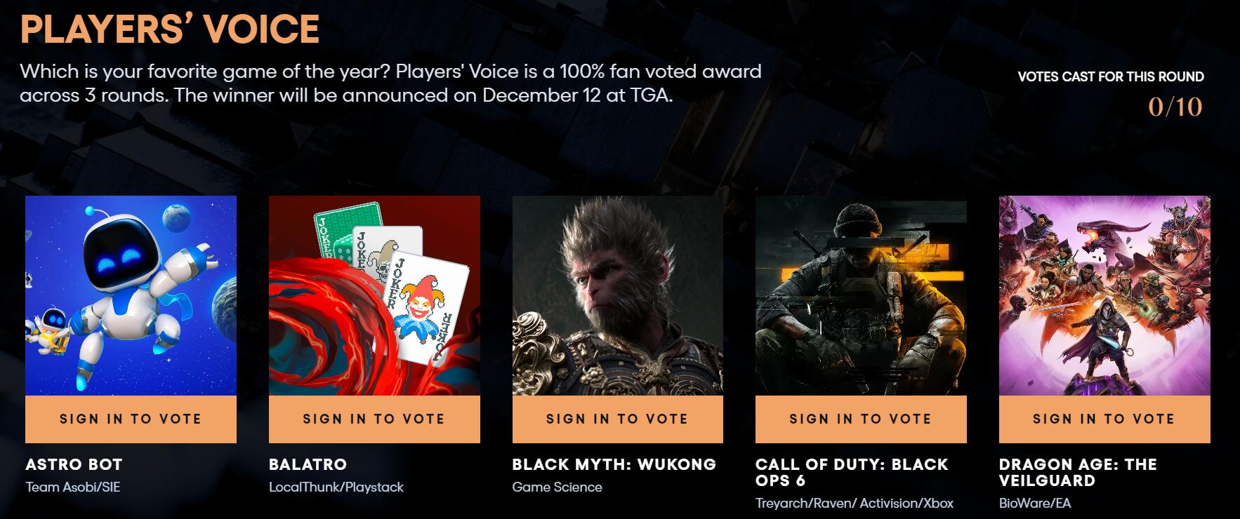 《黑神话:悟空》入围,TGA玩家之声投票现已开启