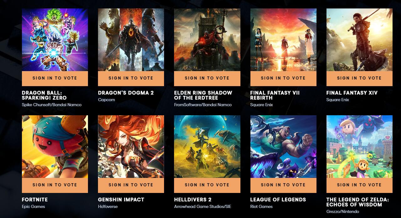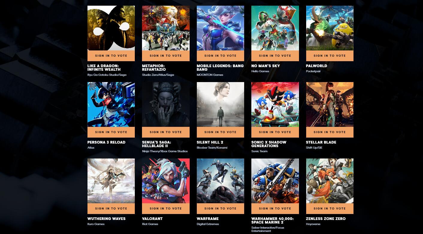 《宇宙机器人》《小丑牌》《黑神话:悟空》《COD:黑色行动6》《龙腾世纪:影障守护者》《七龙珠:电光炸裂Zero》《龙之信条2》《艾尔登法环:黄金树之影》《最终幻想7:重生》《最终幻想14》《堡垒之夜》《原神》《地狱潜兵2》《英雄联盟》《塞尔达传说:智慧的再现》《人中之龙8》《暗喻幻想》《决胜巅峰》《无人深空》《幻兽帕鲁》《女神异闻录3:Reload》《地狱之刃2》《寂静岭2:重制版》《索尼克x夏特:世代重启》《剑星》《鸣潮》《无畏契约》《战锤40K:星际战士2》《绝区零》