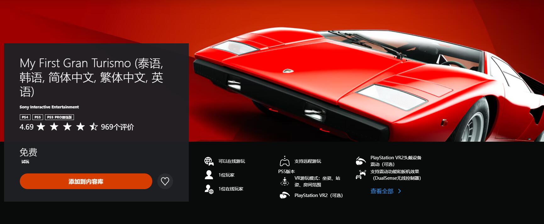 【《我的第一部GT赛车》PSN上获玩家评分4.69】为纪念PlayStation 30周年,由Polyphony Digital所带来DE 《我的第一部GT赛车(My First Gran Turismo)》现已登录PS4和PS5。这是一款适合所有人体验的免费的入门级赛车游戏,玩家可在其中通过完成各种趣味挑战解锁成就。截至目前,游戏在PSN商店中已有980条评价,全球玩家评分4.69,其中五星好评率87%。《我的第一部GT赛车》支持中文,以及PS VR2和PS5 Pro增强。