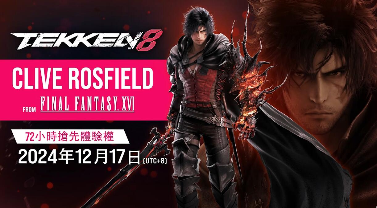 【《最终幻想16》主角克莱夫将于12月20日参战《铁拳8》】万代南梦宫今日公布了旗下3D格斗游戏《铁拳8》第4弹追加角色。他就是来自SE人气作品《最终幻想16》的主角“克莱夫•罗兹菲尔德”。这位联动人物将在12月20日登场,拥有“角色Year 1 Pass”的玩家可在12月17日抢先体验(提前72小时)。《铁拳8》现已登录PS5、Xbox Series、Steam,本作在今年的TGA上获得了最佳格斗游戏奖项的殊荣。