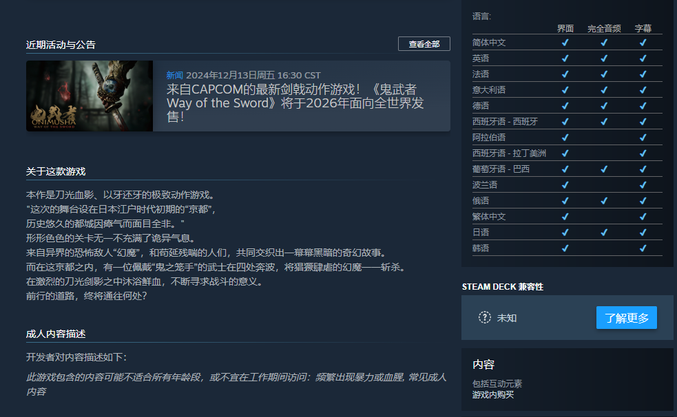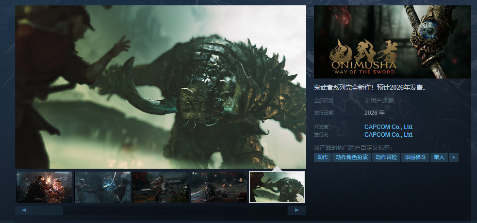 【《鬼武者 Way of the Sword》Steam页面上线,支持中文字幕及配音】在近日的TGA上,卡普空公布了《鬼武者》系列全新作品《鬼武者 Way of the Sword》,并发布了最新预告。目前本作的Steam页面已经上线,在主页中可以得知,本作将包含游戏内购以及支持中文字幕和配音。本作预计于2026年登录PS5、Xbox series和PC平台。