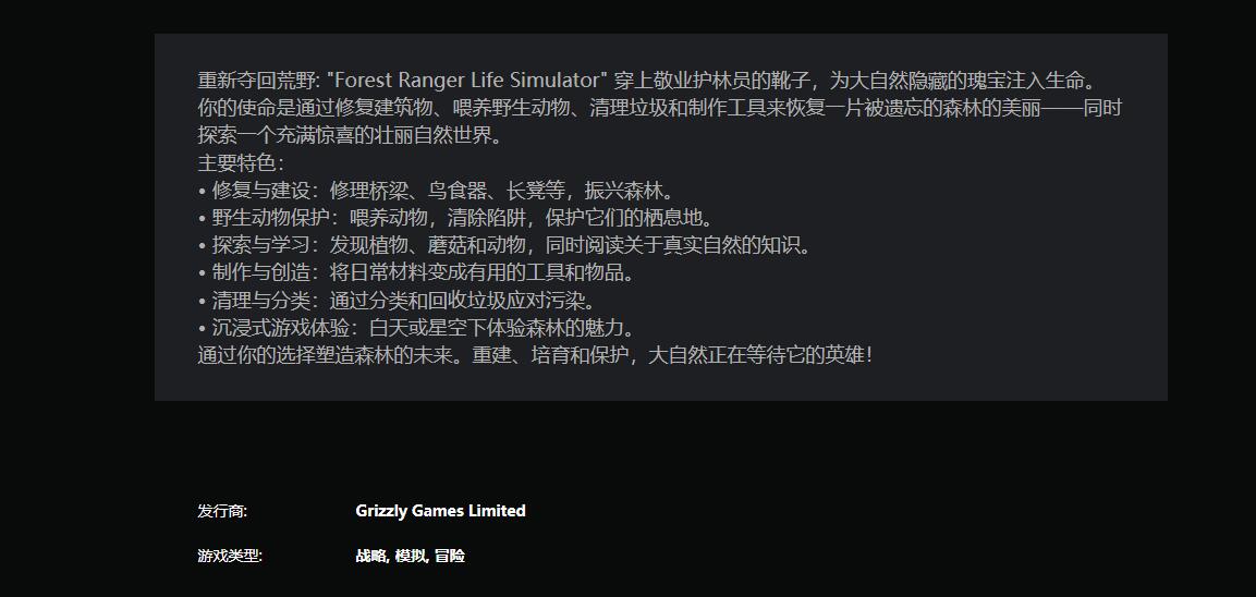 【“乔尔重生之我是森林管理员”PS商店惊现《最后生还者》山寨游戏】近期有不少玩家在PS商店中发现一款名为《护林员生活模拟器(Forest Ranger Life Simulator)》的游戏。从封面图中可以看到,其中角色的外观与《最后生还者》中的乔尔非常相似。根据页面信息显示,游戏中玩家将作为护林员为大自然隐藏的瑰宝注入生命。通过修复建筑物、喂养野生动物、清理垃圾和制作工具来恢复一片被遗忘的森林的美丽,同时探索一个充满惊喜的壮丽自然世界。游戏的发行商为Grizzly Games Limited,类型是战略, 模拟, 冒险,目前推出日期待定。