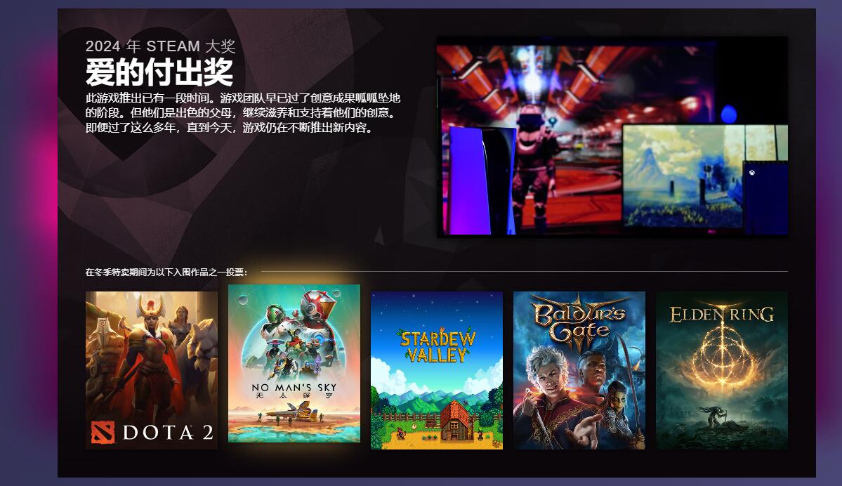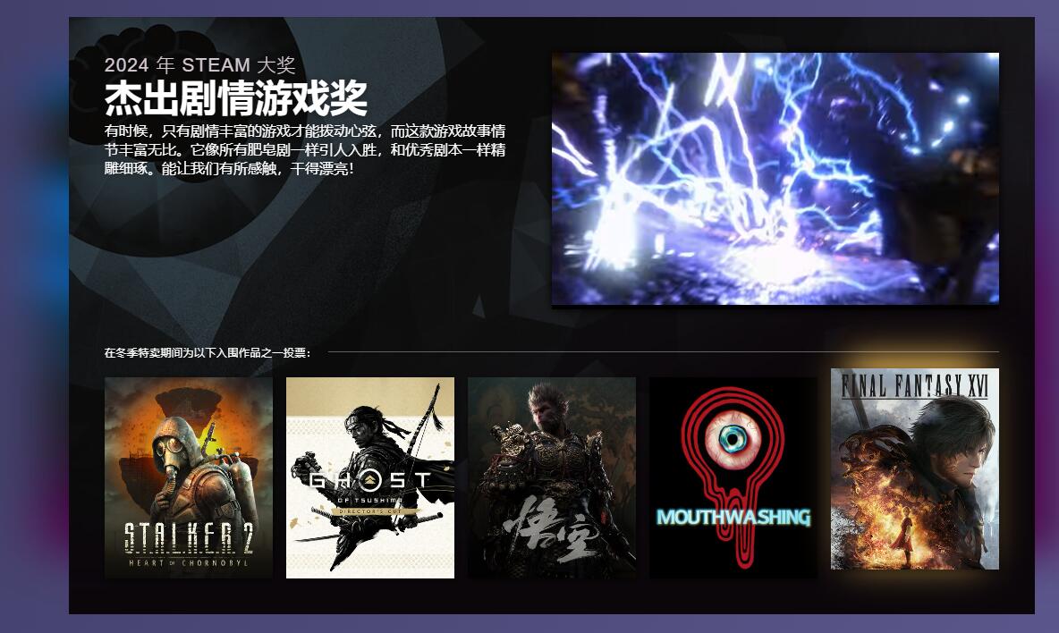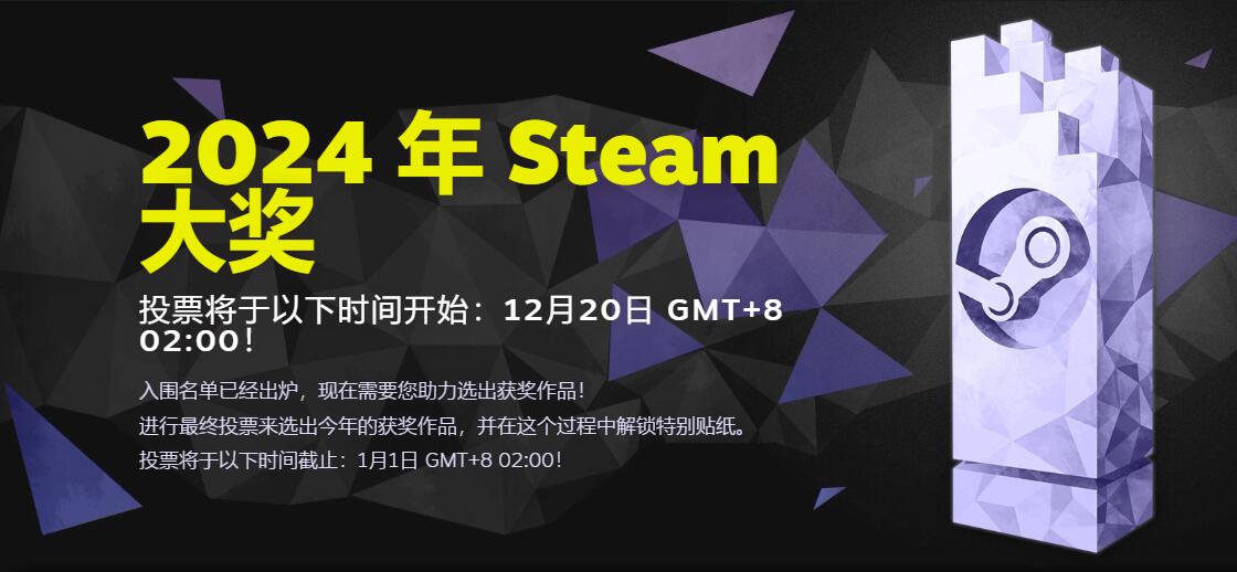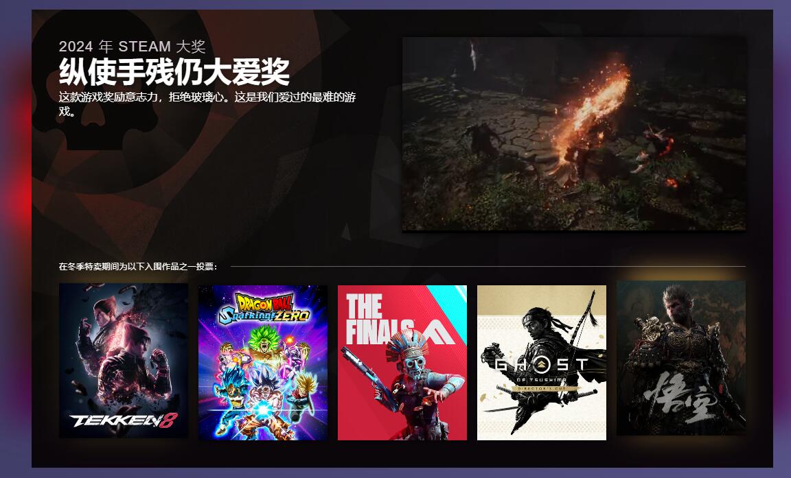 【《黑神话》获得3项提名!2024年Steam大奖入围名单出炉】2024年Steam大奖入围名单现已出炉,其中《黑神话:悟空》获得了“年度最佳游戏奖”“纵使手残仍大爱奖”“杰出剧情游戏奖”三项提名。玩家可在12月20日凌晨2点~1月1日凌晨2点期间进行最终投票来选出今年的获奖作品,并在这个过程中解锁特别贴纸。所有获奖作品将于1月1日凌晨2点揭晓。具体名单如下,点击首图可查看视频。