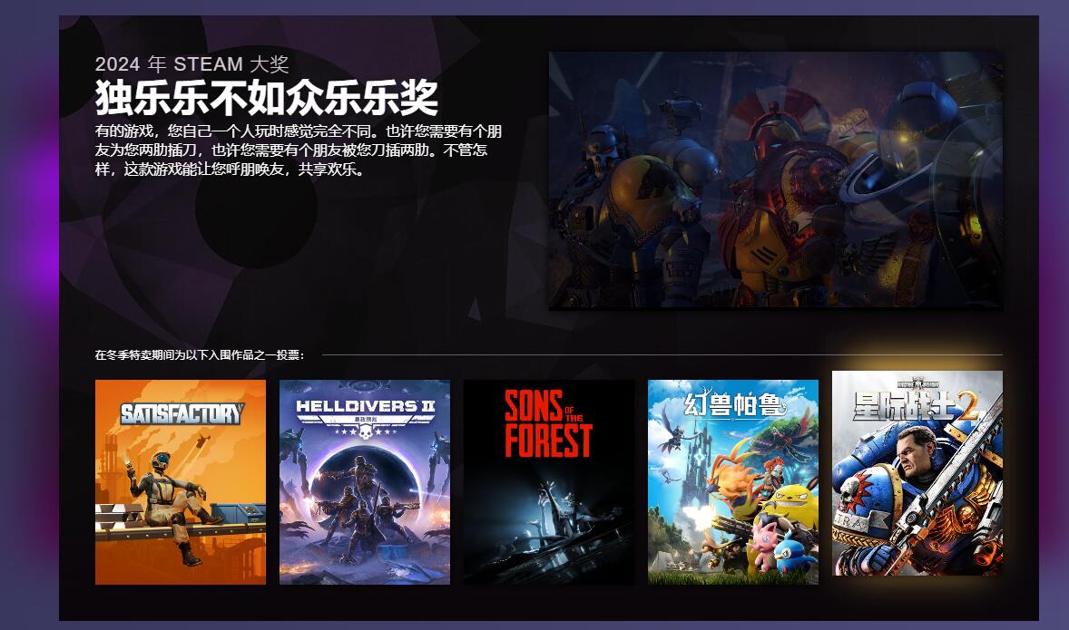 《幸福工厂》《地狱潜兵2》《森林之子》《幻兽帕鲁》《战锤40K:星际战士2》