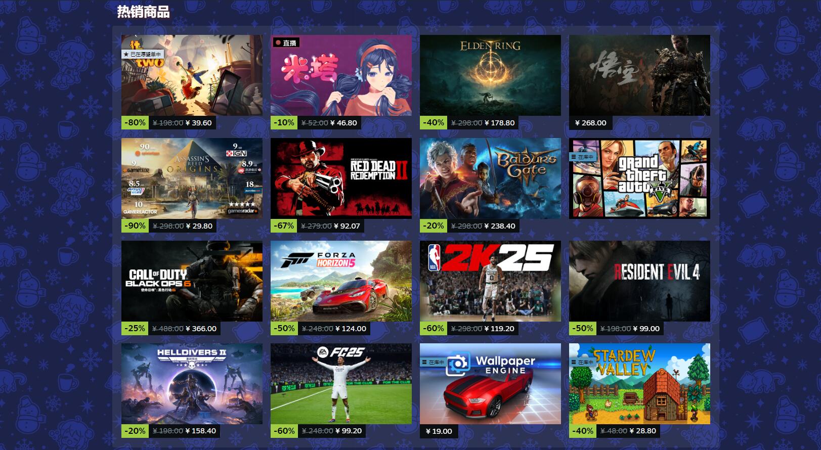 【Steam冬季特卖开始,2024年大奖投票现已开通】Steam冬季特卖活动已于今日开启,活动截止时间到1月3日,期间商店里诸多游戏正在打折促销中。其中包括《艾尔登法环》《战神:诸神黄昏》《COD:黑色行动6》《潜水员戴夫》等热门游戏。浏览探索队列,还可获取免费贴纸。