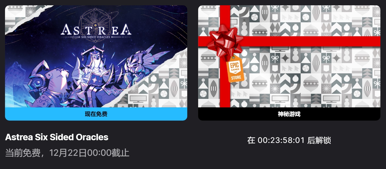 【Epic喜+1】骰子构筑游戏《阿斯特赖亚(Astrea: Six-Sided Oracles)》现已可在Epic商店中免费领取,领取后永久入库,截止时间为12月22日00:00。下一款免费神秘游戏将在12月22日00:00开始领取。