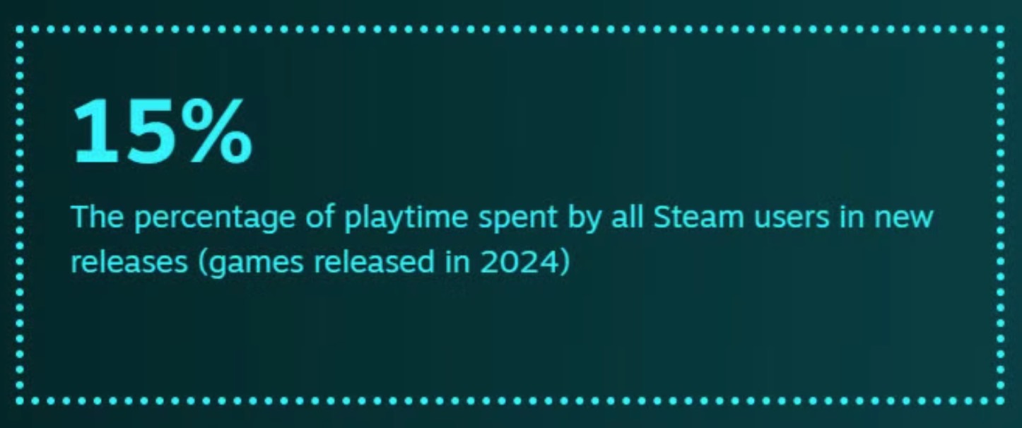 【2024年Steam用户玩新游戏时间仅占15%】根据Steam对全球玩家游戏时间统计,今年玩家们在2024年新游戏的时间投入上只有15%。玩家们将47%的游戏时间投入给过去1到7年内发布的游戏。另外37%的游戏时间用于8年或更早的游戏。