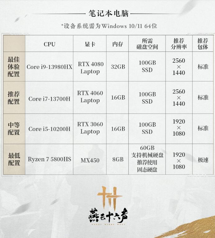 【《燕云十六声》PC配置要求公布,移动端公测即将到来】距离《燕云十六声》公测仅剩4天的时间,官方今日宣布,游戏即将于12月25日上午11点在官网开启PC客户端的预载。至于大家所关心的移动端,据悉团队目前正在优化移植体验和性能,以及和硬件厂商进行最后的冲刺联调。故移动端上线距离PC公测不会相隔很久。此外,PC公测开启之后,PC云游戏端也将稍后开放。最后,官方还放出了PC端的具体配置要求。其中硬盘推荐使用SSD,最低需要i7-4770K+GTX 750Ti的配置,详细要求请参考附图。《燕云十六声》PC公测将在12月27日正式开启。