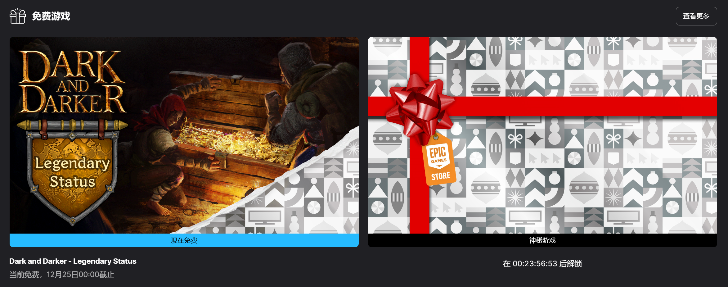 【Epic喜+1】免费PVPVE地牢冒险游戏《越来越黑暗 (Dark and Darker)》 “传奇身份” DLC 现已可在Epic商店中免费领取,领取后永久入库,截止时间为12月25日00:00。下一款免费神秘游戏将在12月25日00:00开始领取。
