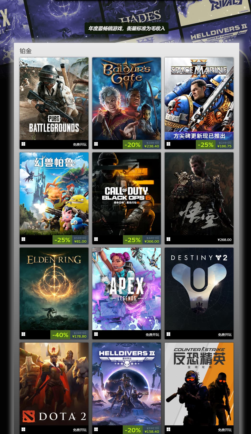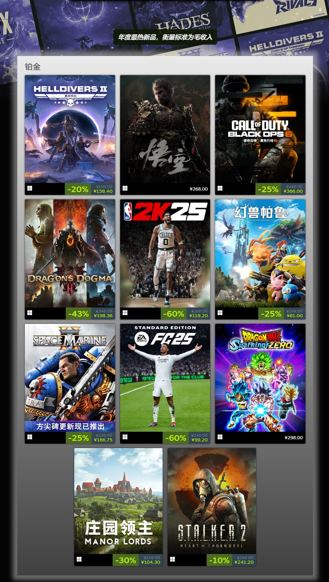 新品游戏(根据发行后前两周收入计算):《地狱潜兵2》《流放之路2》《黑神话:悟空》《COD:黑色行动6》《龙之信条2》《NBA 2K25》《幻兽帕鲁》《战锤40K:星际战士2》《EA SPORTS FC 25》《七龙珠电光炸裂Zero》《庄园领主》《潜行者2》。