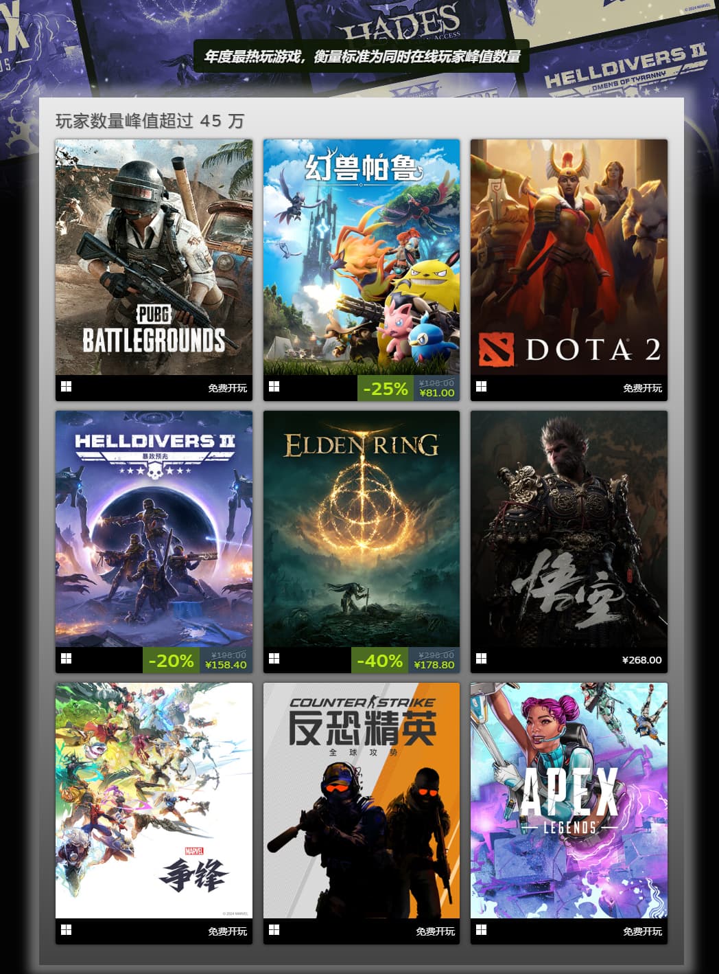 最热游玩(根据同时在线玩家数量峰值计算):《幻兽帕鲁》《地狱潜兵2》《艾尔登法环》《流放之路2》《黑神话:悟空》。